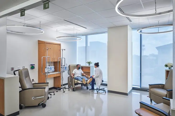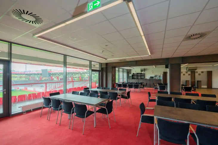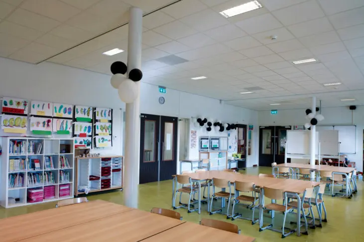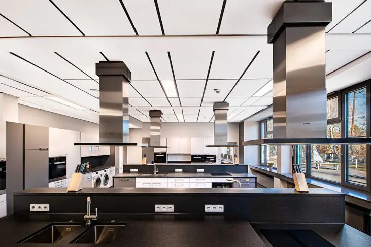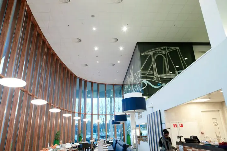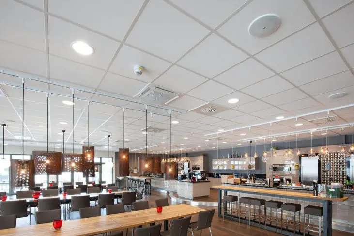 Perforated mineral board with an acoustic fleece facing & anti-microbial treatment.
